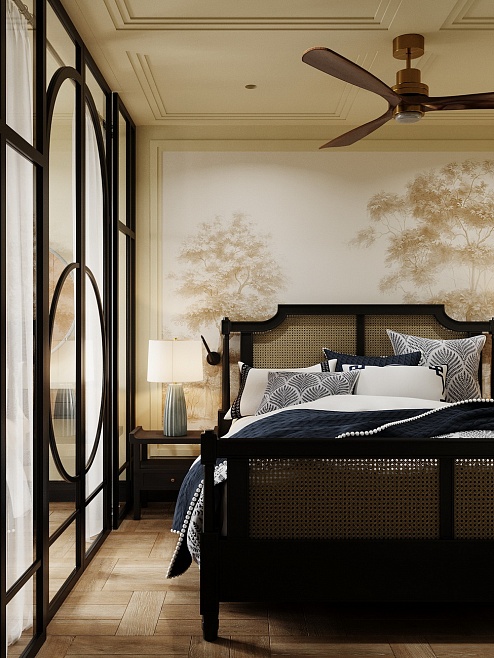 При этом интерьер получился строгий, за счет брутальной мебели с азиатскими мотивами,