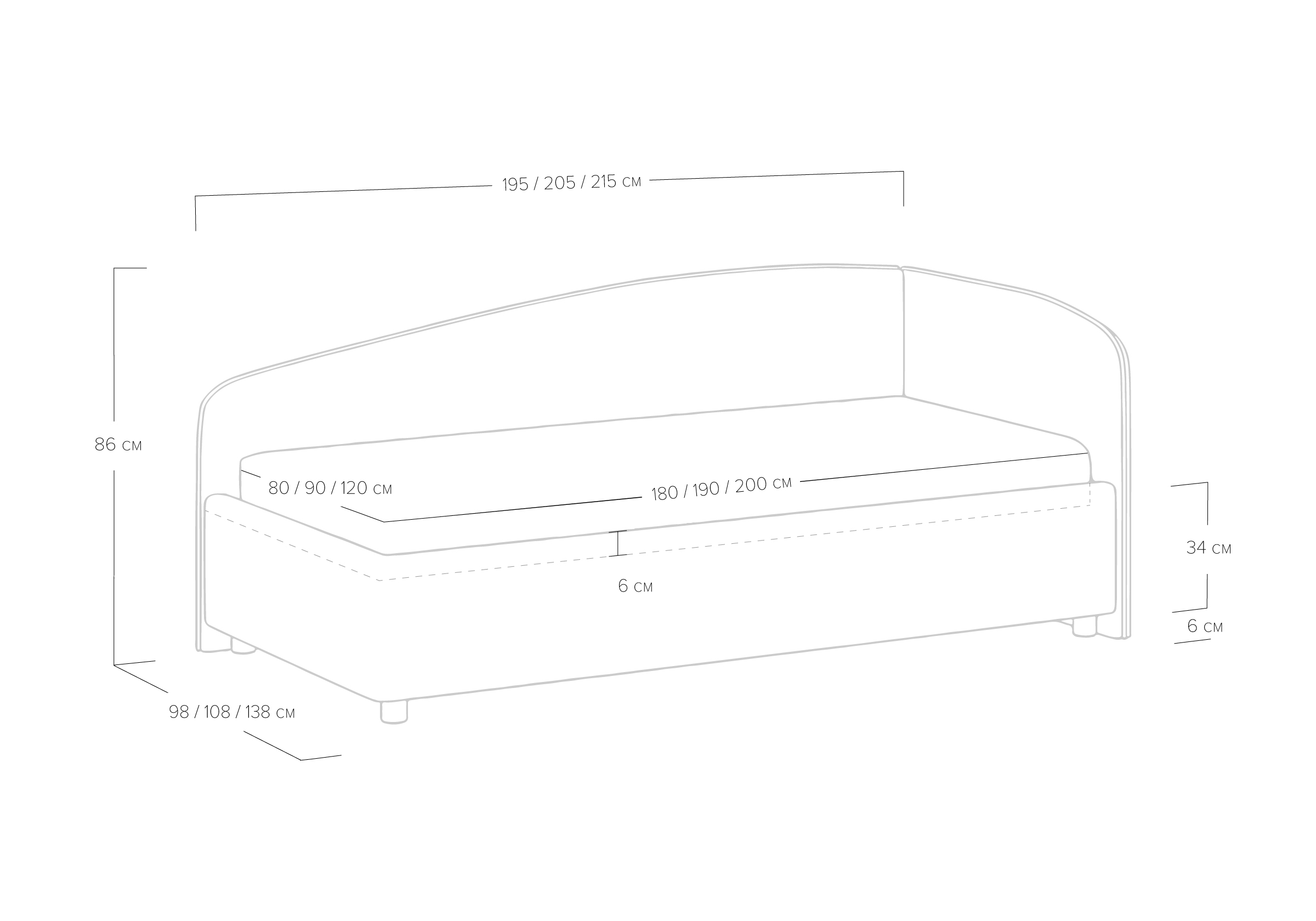 Односпальная кровать для ребенка или подростка. Модель изготовлена из ДСП. При необходимости кровать может быть укомплектована разборным или неразборным металлическим основанием с ламелями, подъемным механизмом с бельевым ящиком.