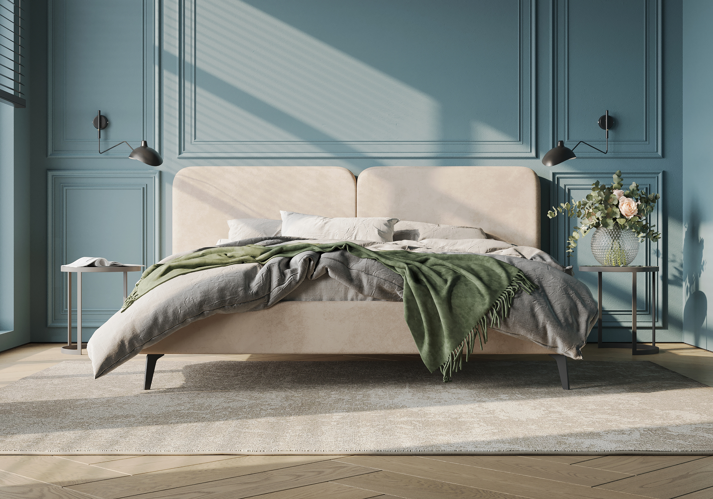 Основание кровати на металлических элегантных опорах. Благодаря увеличенной высоте позволяют осуществлять легкую уборку под кроватью, даже с помощью робота-пылесоса.