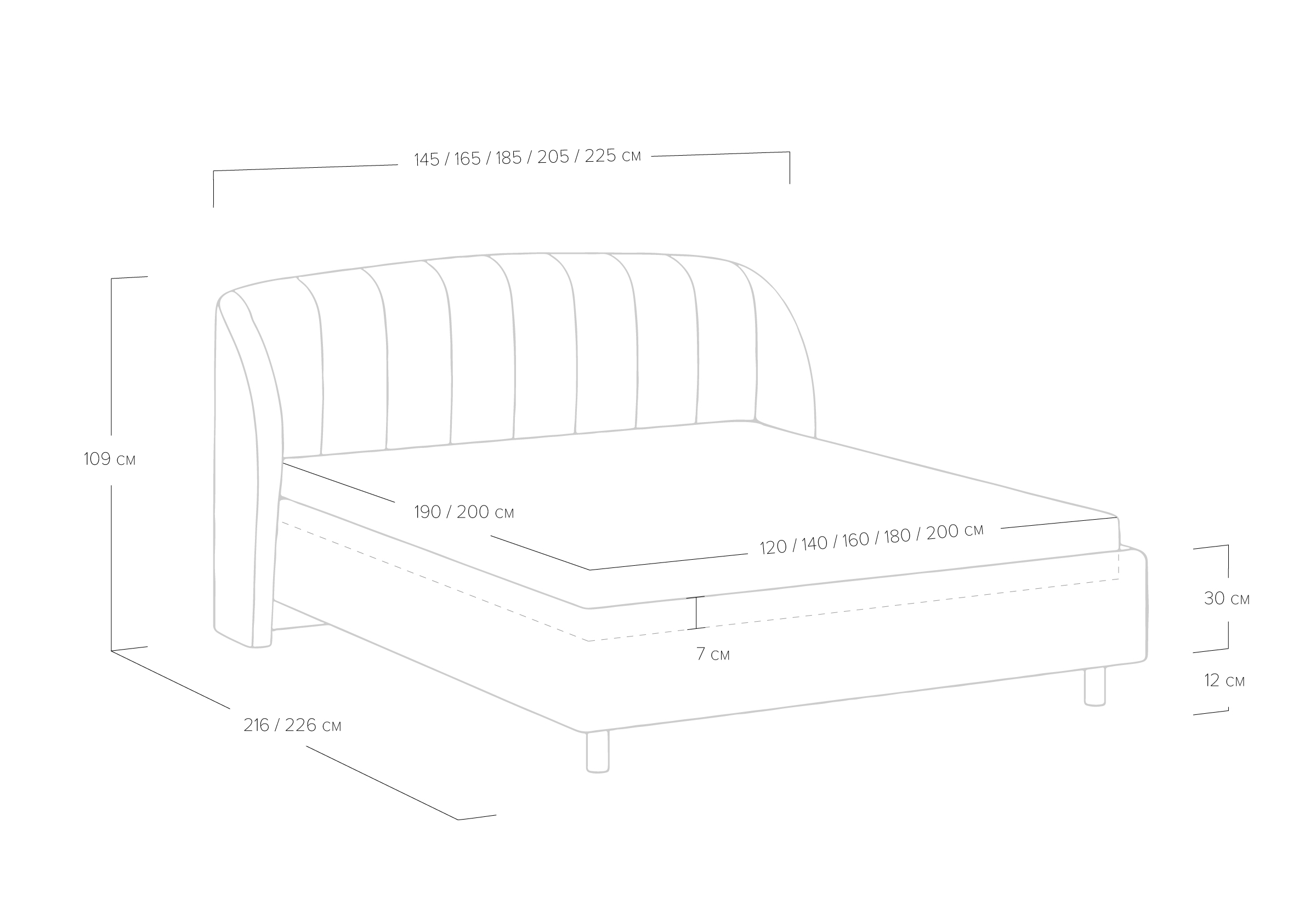 Кровать Valencia выполнена в стиле модерн. Акцент на мягкое округлое, объемное изголовье. Кровать подарит особое чувство спокойствия, уюта, а закругленные боковые элементы обеспечат чувство защищенности во время отдыха. Сделать модель по истине эффектной поможет широкий выбор обивочной ткани. При необходимости кровать может быть укомплектована разборным или неразборным металлическим основанием с ламелями, подъемным механизмом с бельевым ящиком, трансформируемым основанием Aquarius.