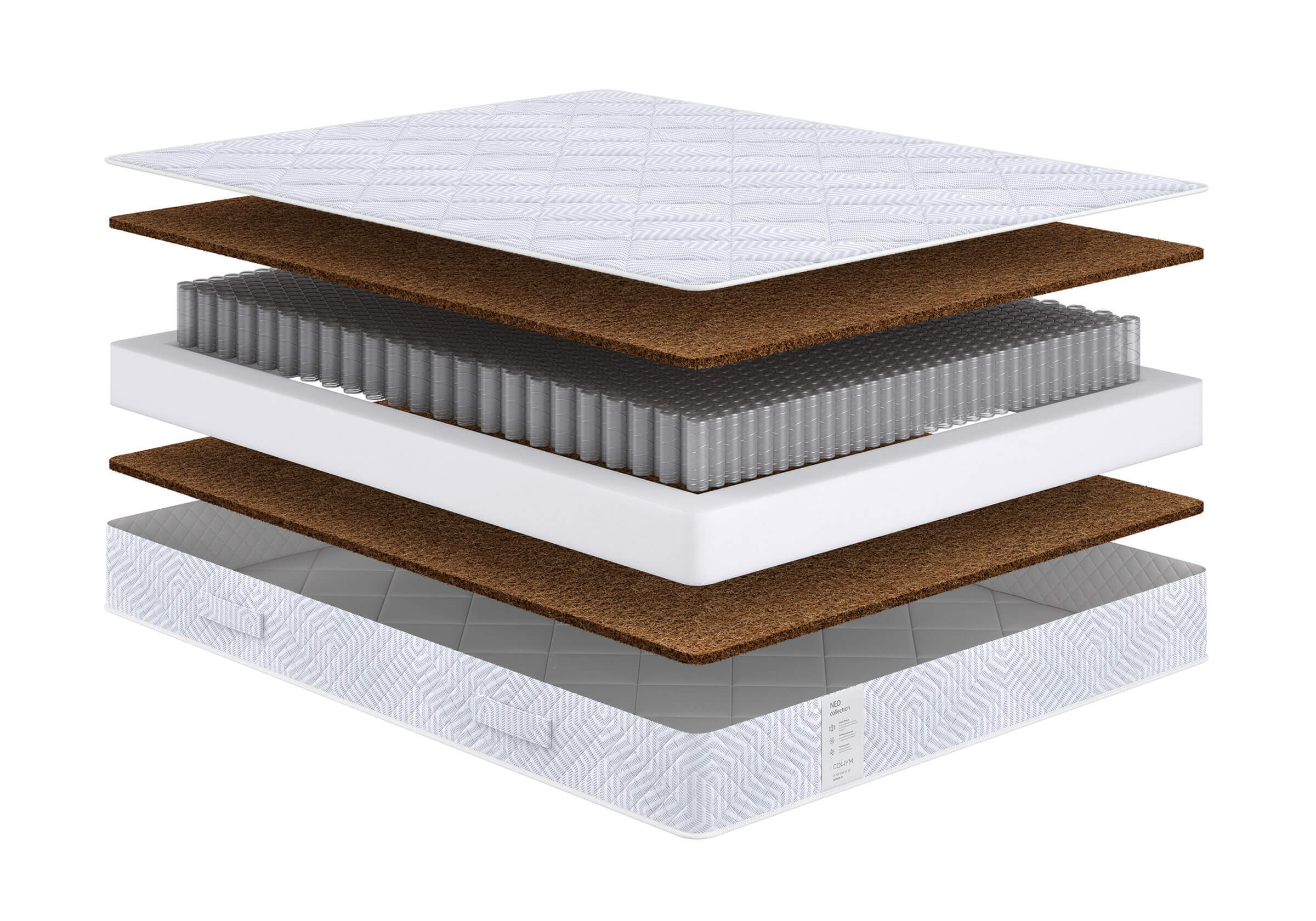 Жесткий двусторонний матрас с кокосовой койрой в составе. Она обладает воздухопроницаемостью, антибактериальными свойствами и поддерживает благоприятный микроклимат спального места. Независимый пружинный блок равномерно распределяет нагрузку и снимает напряжение с позвоночника.