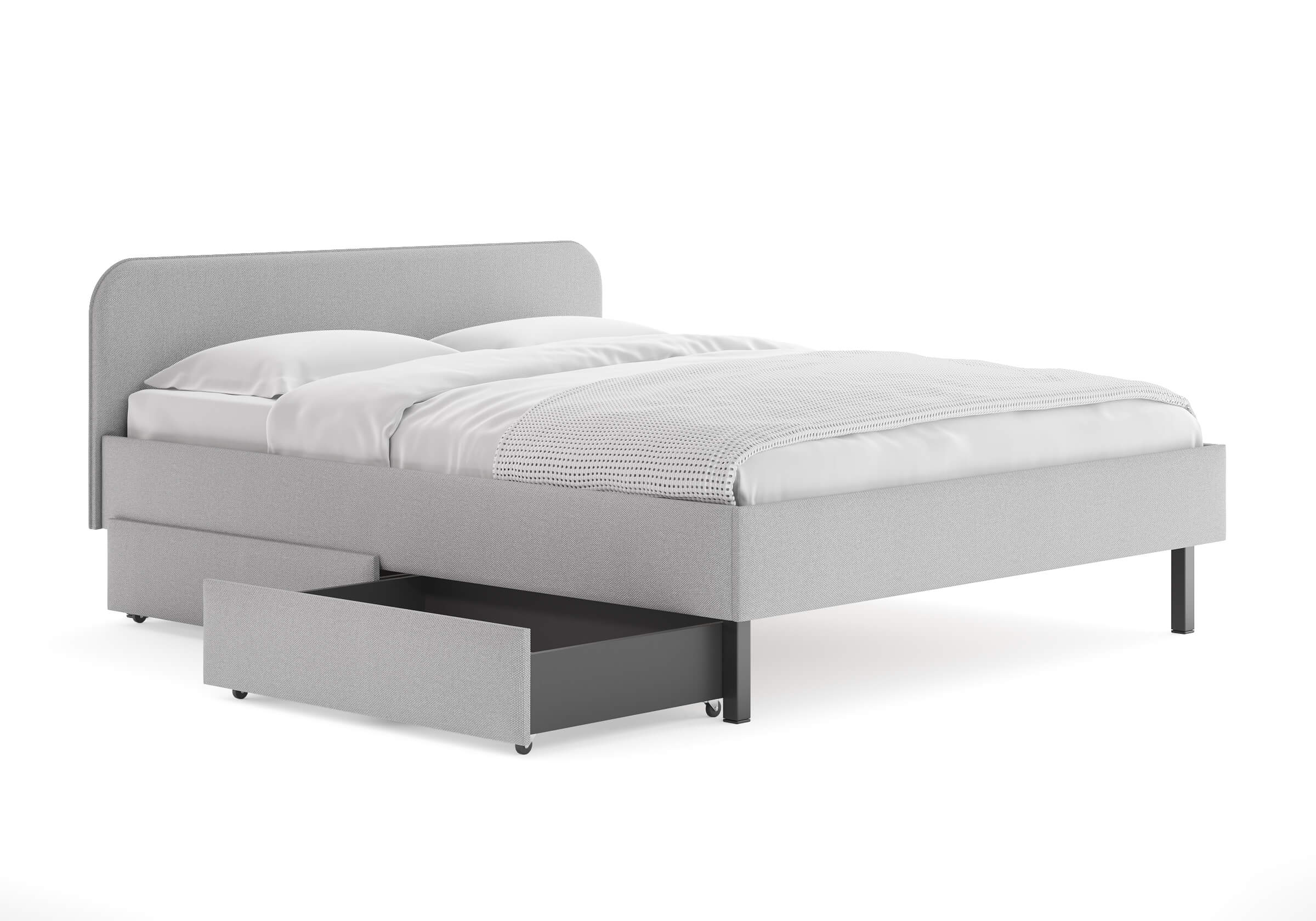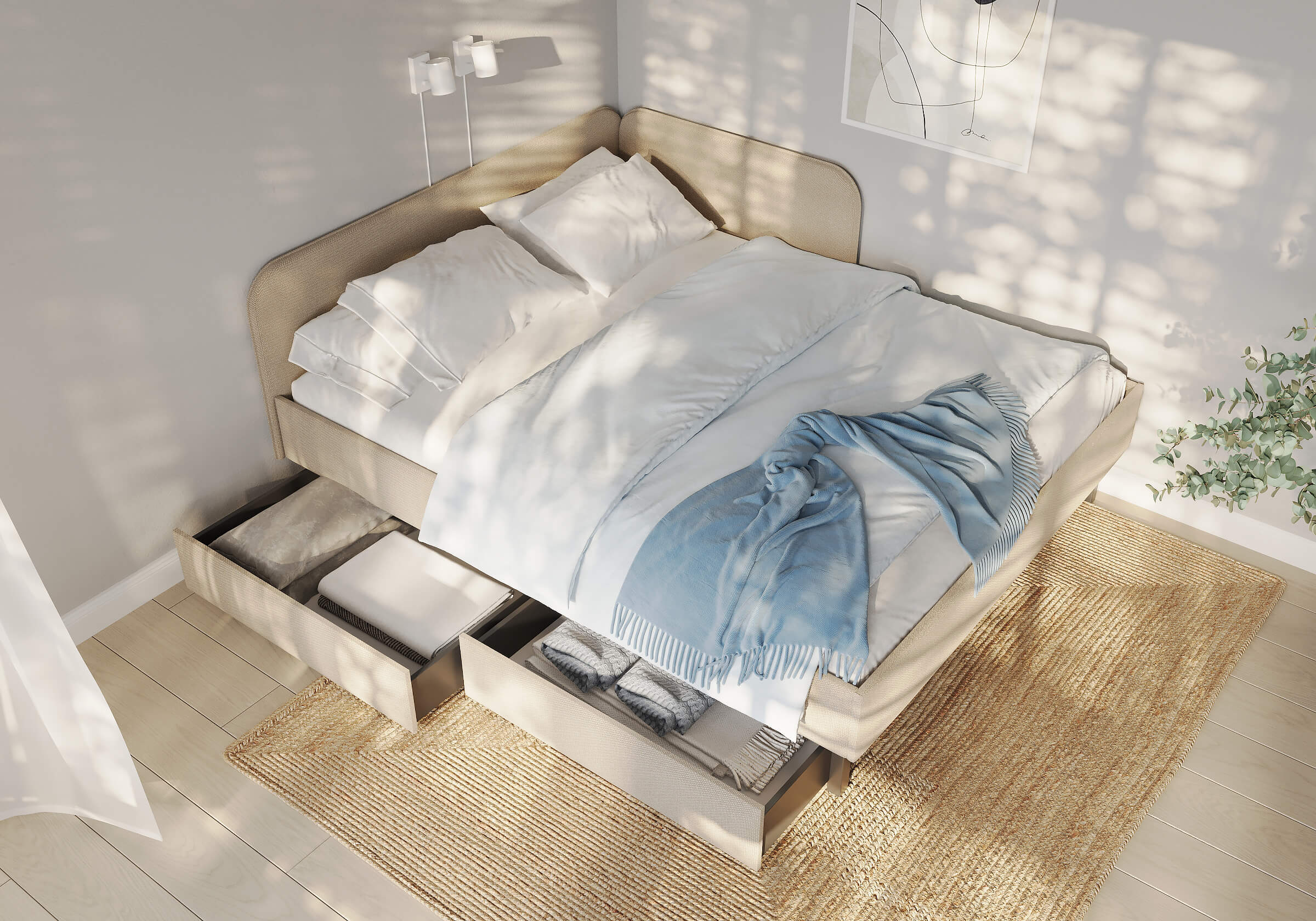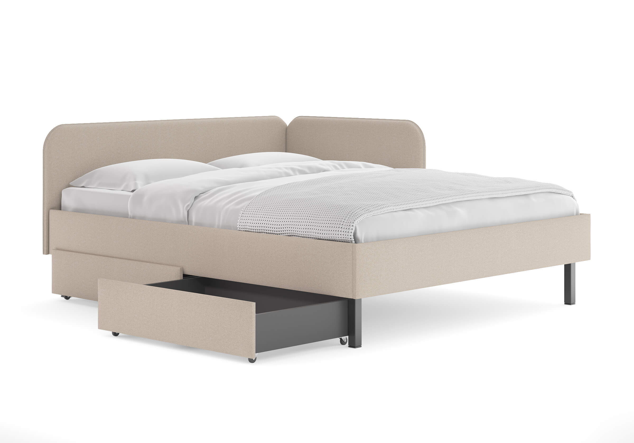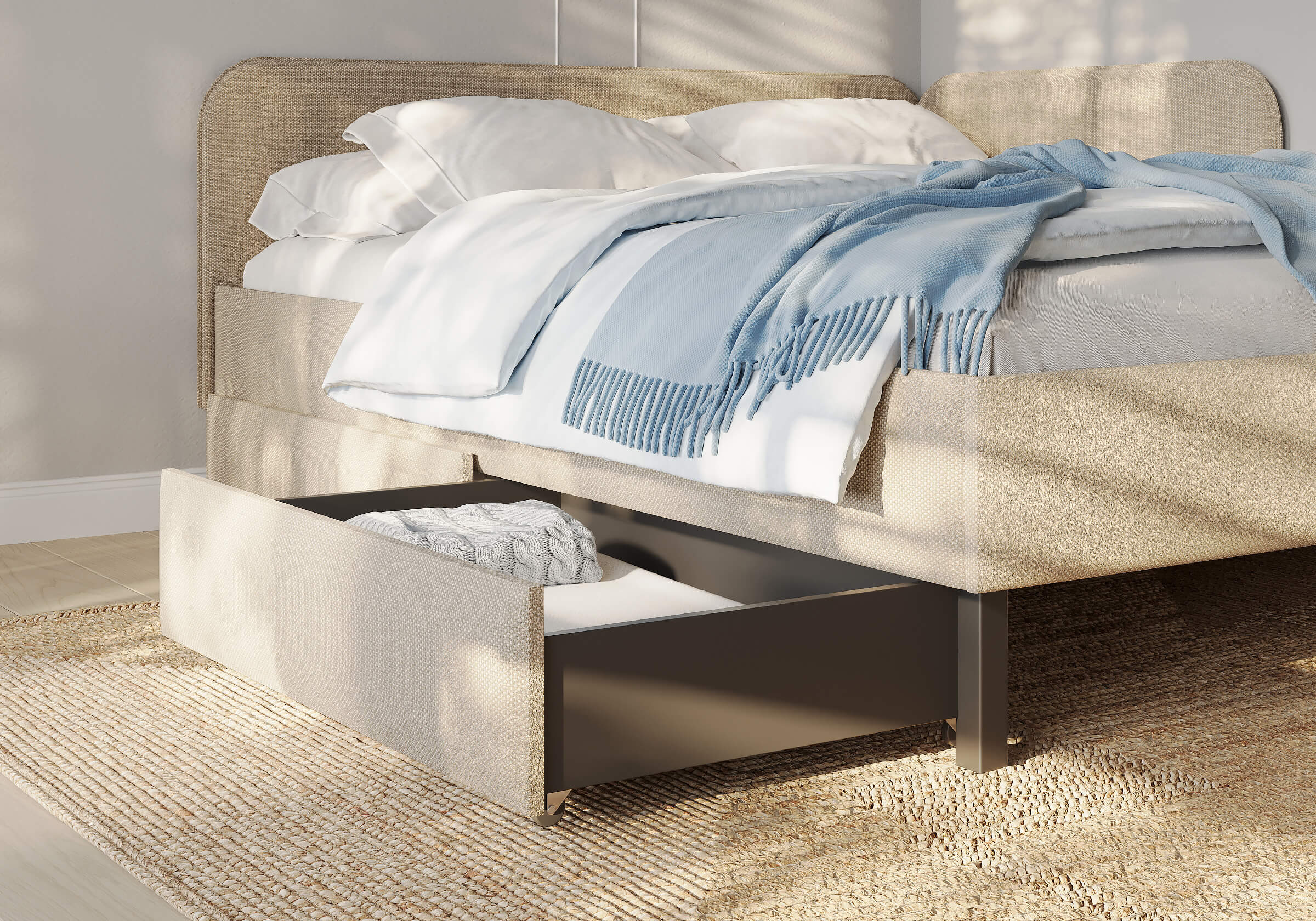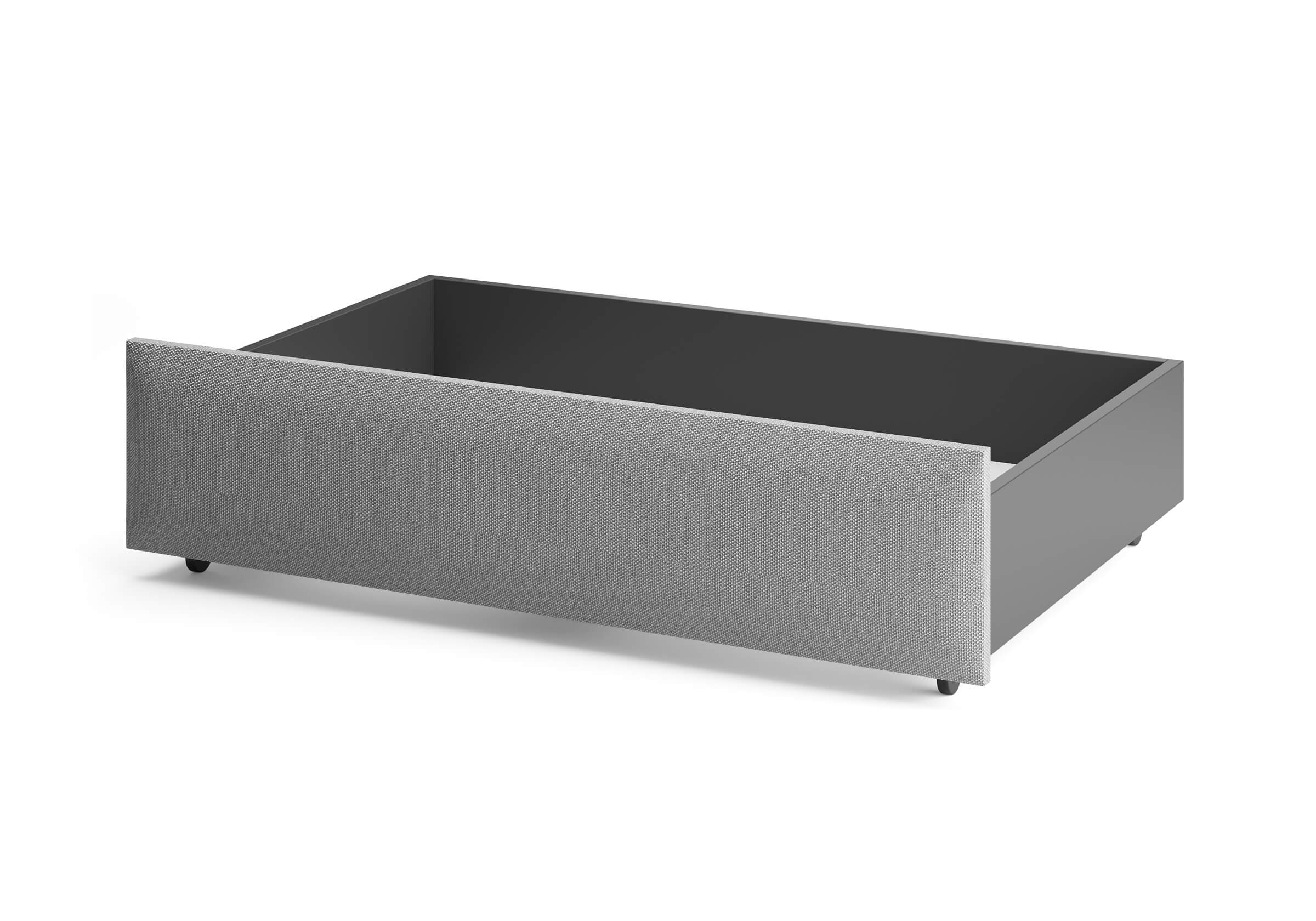 Фасад ящика мягкий, выполнен в практичной рогожке багама - 3 цвета: льняной, бежевый, серый.